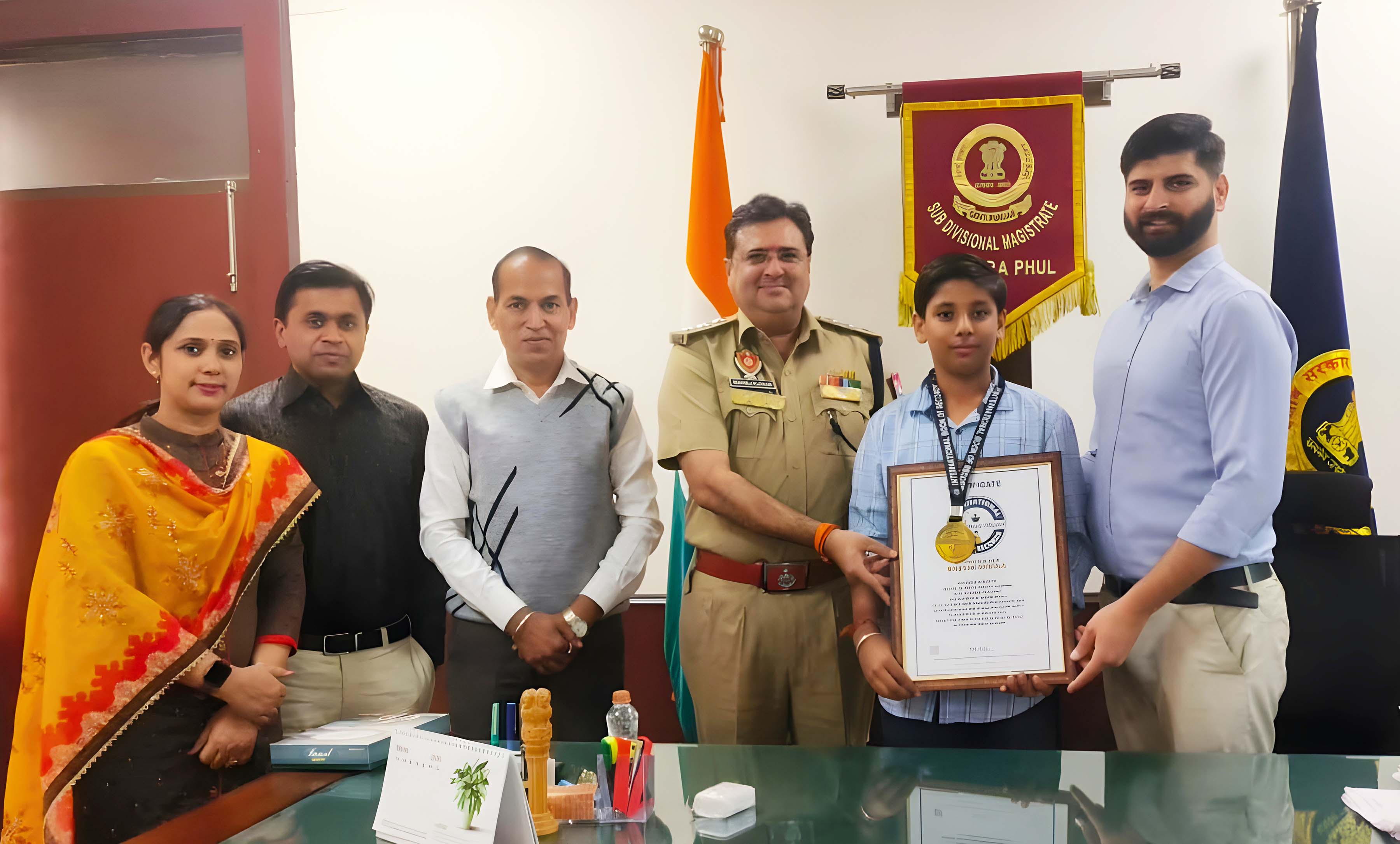 Naksh Bansal set a new World Record by flawlessly reciting the multiplication table of 100032922 up to 100 rows in just 4 minutes. He was honored for this remarkable achievement by DSP S. Pardeep Singh.