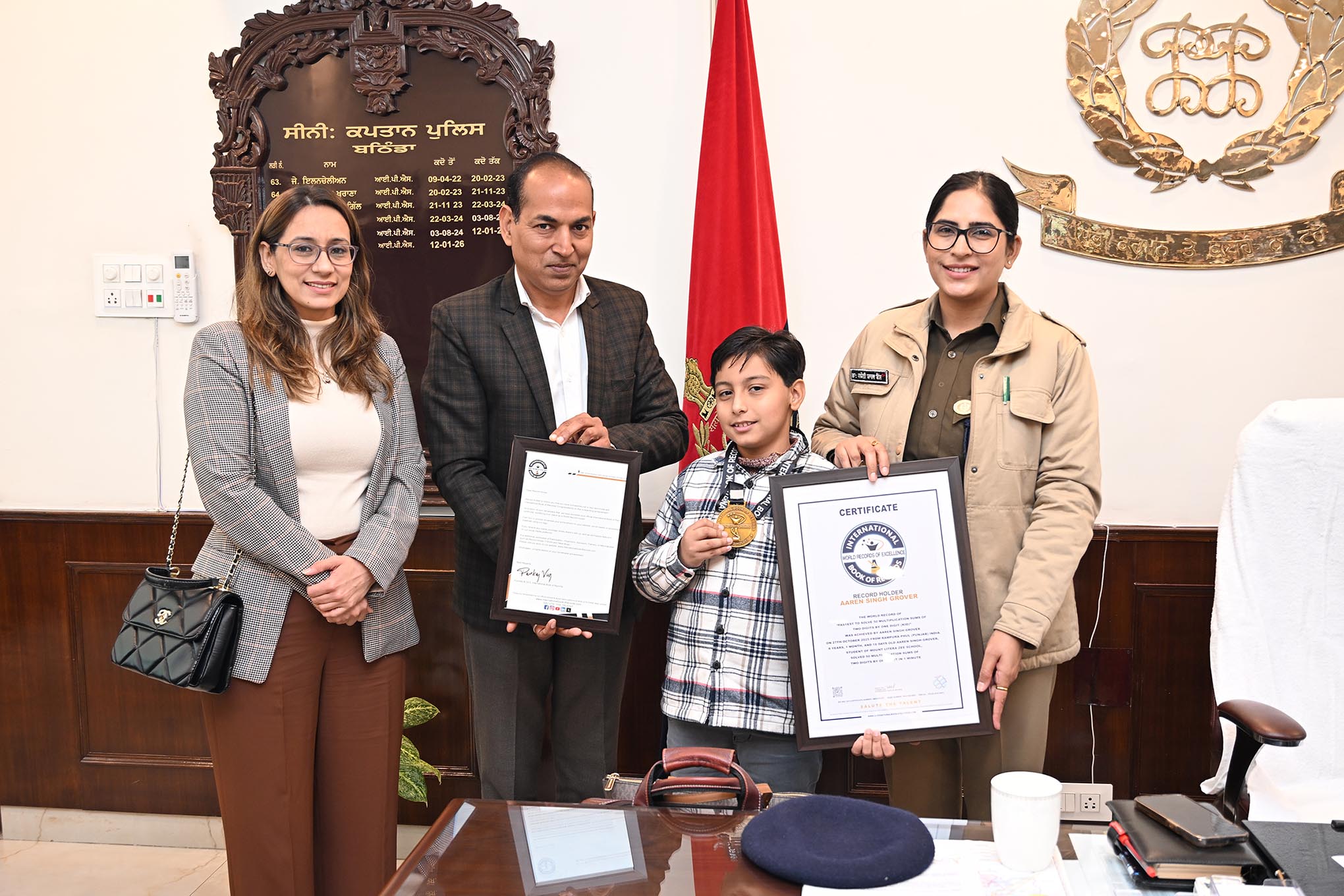 Aaren Singh Grover set a new world record by solving 50 multiplication sums (2-digit × 1-digit) on paper in just 1 minute. He was honoured for this outstanding achievement by SSP Bathinda, Dr. Jyoti Yadav, IPS.